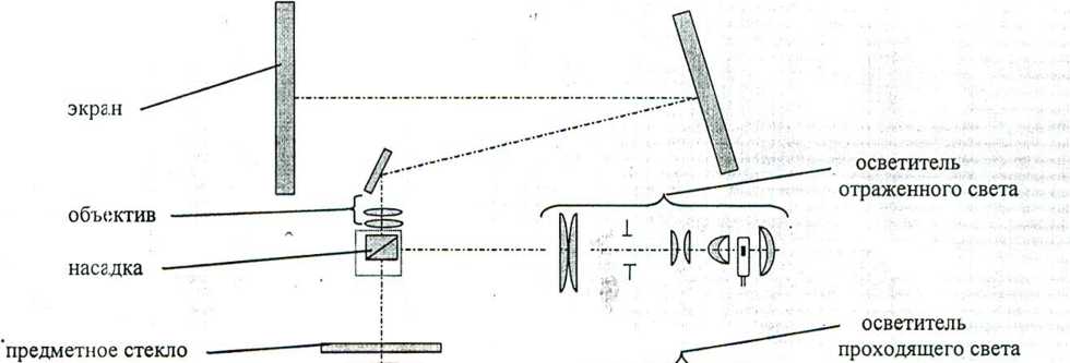 При работе с осветителем отраженного света лучи при помощи насадки освещают проверяемую поверхность детали, установленную на предметном стекле, отражаются от нее и, пройдя объектив создают на экране изображение этой поверхности.