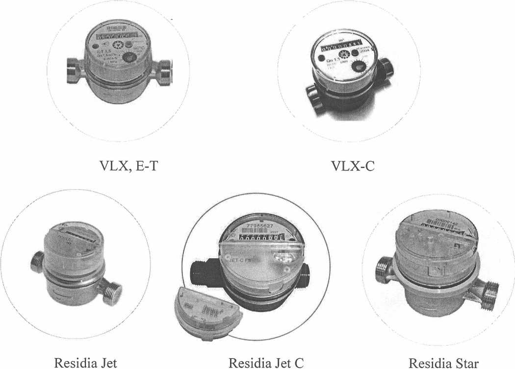 Счетчики выпускаются под торговыми марками VLX, Е-Т, VLX-C, Residia Jet, Residia Jet C, Residia Star. Принципиальных отличий по конструкции у приборов типа VLX и Е-Т не имеется.