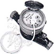 Принцип действия счетчиков основан на измерении числа оборотов крыльчатки, вращающейся под воздействием потока протекающей воды. Поток воды понадает в корпус счетчика, а затем в измерительную вставку через ряд тангенциальных отверстий, расположенных но периметру се нижней части. Внутри измерительной вставки установлена крыльчатка. Вода, пройдя измерительную вставку, через ее выходные отверстия в верхней части понадает в выходной патрубок корпуса счетчика. Количество оборотов крыльчатки передается в счетный механизм с помощью магнитной муфты.