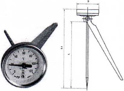 Термометры состоят из круглого корпуса, в котором размещены циферблат и кинематический механизм со стрелкой, и биметаллического термочувствительного элемента в защитной трубке (термобаллона).