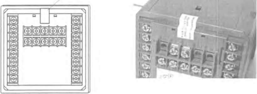 На задней панели расположен клеммный блок с контактами питания 220 В, заземления, аналогового входа, выхода сигнализации, силовых реле (-ЗР), оптосимисторов (-1Р2С), встроенного блока питания 24В (-БП), токового выхода (-Т), сетевого интерфейса RS-485 (-RS485).