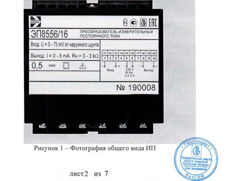 Преобразователи измерительные постоянного тока ЭП8556 соответствуют требованиям ТУ РБ 300080696.056-2000, ГОСТ 24855-81, ТР ТС 004/2011 и ТР ТС 020/2011.