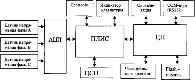 Измерительная информация с датчиков напряжения попадает в АЦП, где преобразуется в цифровой код. Цифровой код, несущий измерительную информацию, передается в ПЛИС.