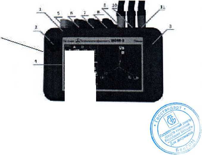 Прибор ВФМ-3 выполнен в изолированном корпусе из ударопрочной пластмассы. Корпус состоит из: верхней крышки (1) и основания, соединенных 4-мя винтами. На верхней крышке (1) имеются кнопка включения питания прибора (2) и кнопка переключения режима измерения (3), жидкокристаллический дисплей (4). На боковой поверхности корпуса гнездо желтого цвета (5) для присоединения сигнала напряжения фазы А, гнездо зеленого цвета (б) для присоединения сигнала напряжения фазы В. гнездо красного цвета (7) для присоединения сигнала напряжения фазы С, гнездо черного цвета (8) для присоединения к нулю. Гнезда (9, 10, 11) на боковой поверхности прибора служат для подключения токовых клешей на фазы А, В и С соответственно.