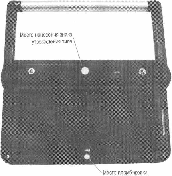 На рисунке 2 показаны место пломбировки корпуса предотвращения несанкционированного доступа и место нанесения зн (аккумулятор снят, ручка поднята).