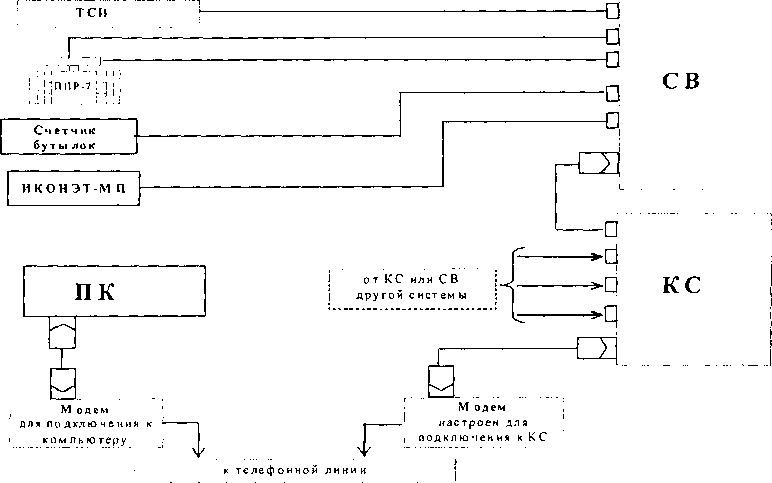 Система включает в себя специализированный вычислитель СВ-5 (в дальнейшем - СВ) контроллер связи КС, модем, устройство сбора и обработки информации на базе персонального компьютера и устройства, именуемые в дальнейшем датчиками:
